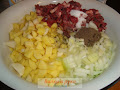 Положите в массу растительное масло, горчицу, уксус, перец и соль.