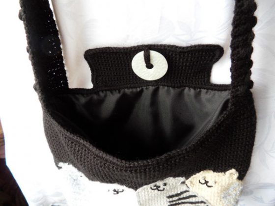 Ещё один вариант сумки с треугольной «крышечкой», которая застёгивается на большую пуговицу. Коты специально обшиты по контуру так, чтобы были видны «торчащие шерстинки» (при перекрещивании нитей двух цветов могут оставаться такие «хвостики»). Если они не нравятся, нужно просто обшить контур более толстой нитью, которая сделает силуэт гладким.