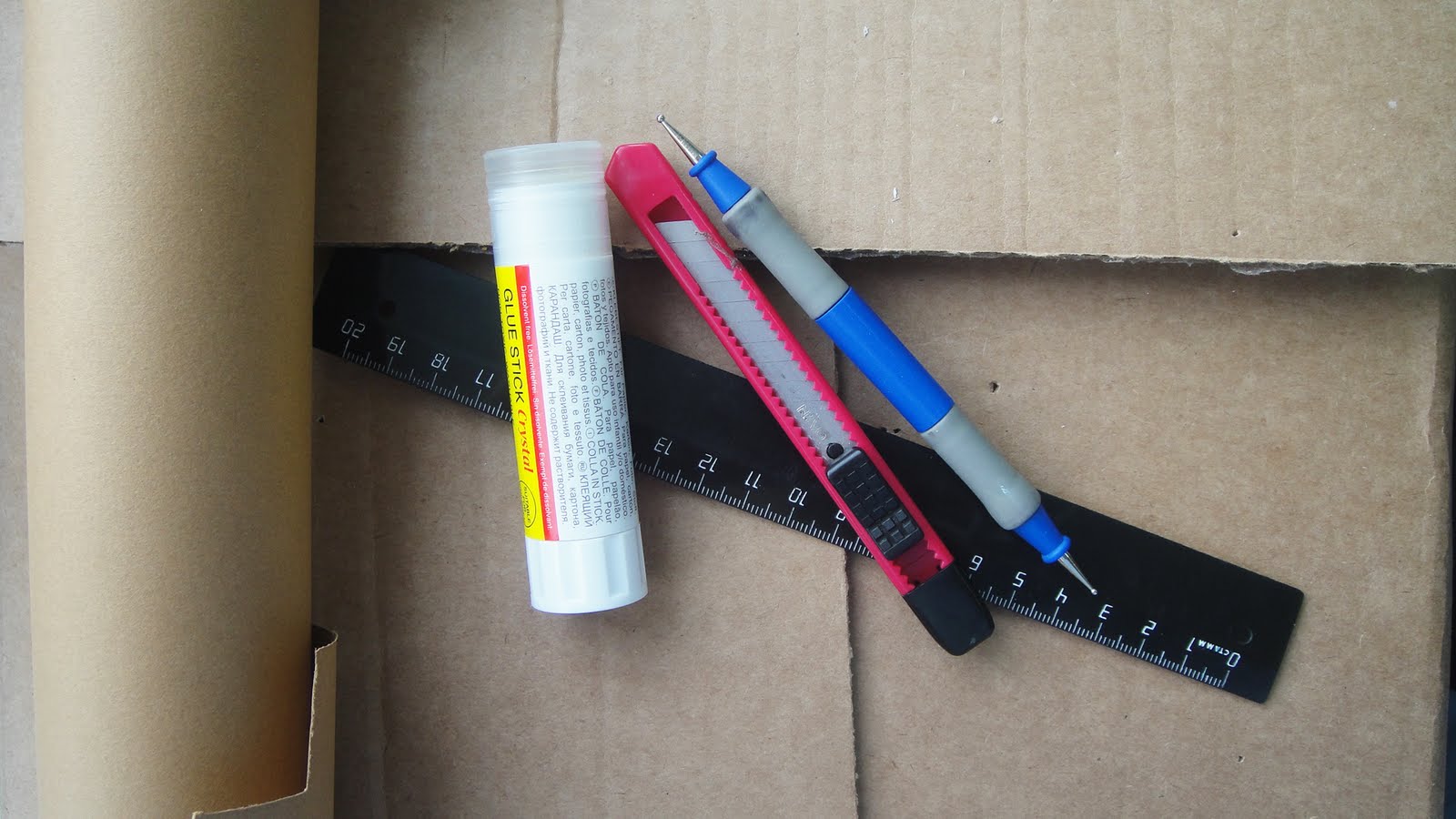 - двусторонний скотч или клей, клеевой пистолет или суперклей, макетный нож или ножницы,  линейка, карандаш, установщик люверсов