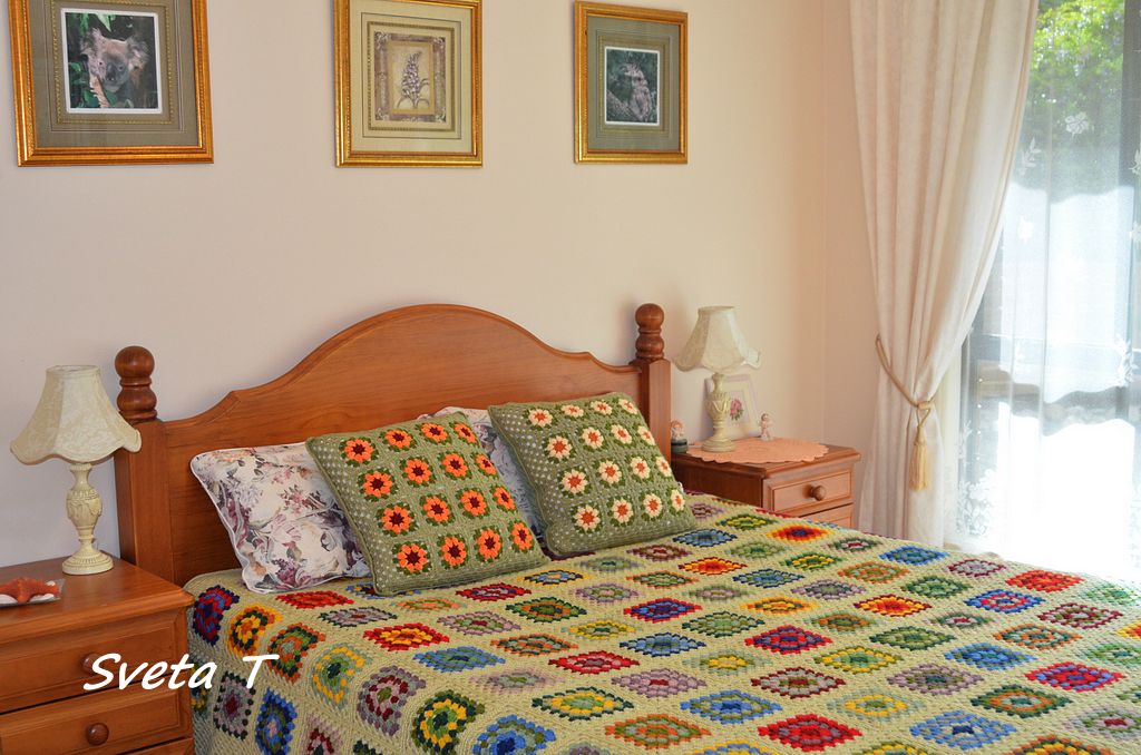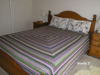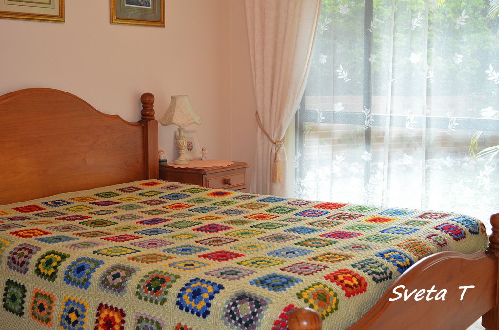 На плед израсходовалось 2,2 кг акрила Moda Vera Marvel 8ply. Размер покрывала 2,4 м х 2,4 м, крючок № 4. Для придания жесткости краю я обвязала его двумя рядами столбиков без накида.