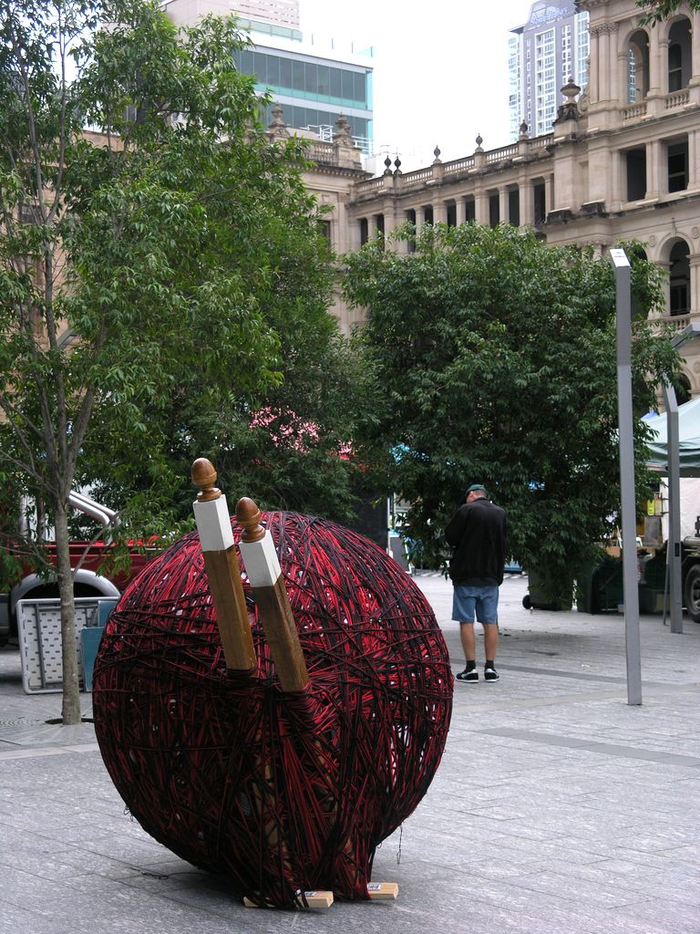 Группа энтузиастов с Ravelry, назвавших себя "I knit BNE" (BNE аббревиатура от Brisbane), решили немного развеcелить и согреть Сити в июне, украсив центр города гигантскими мотками пряжи, шарфиками, пончо, свитерами и помпонами. Символ этой веселой акции - зеленое вязаное сердечко.