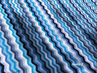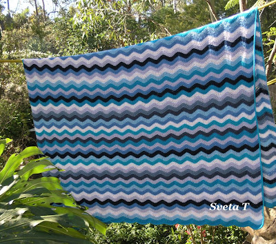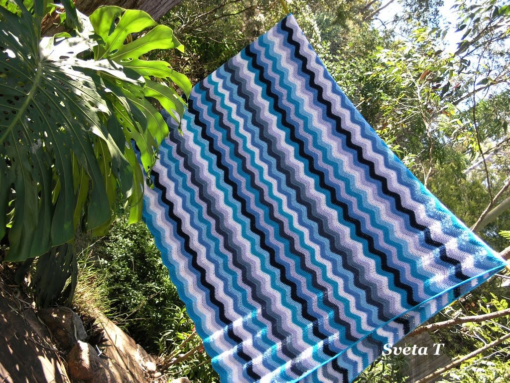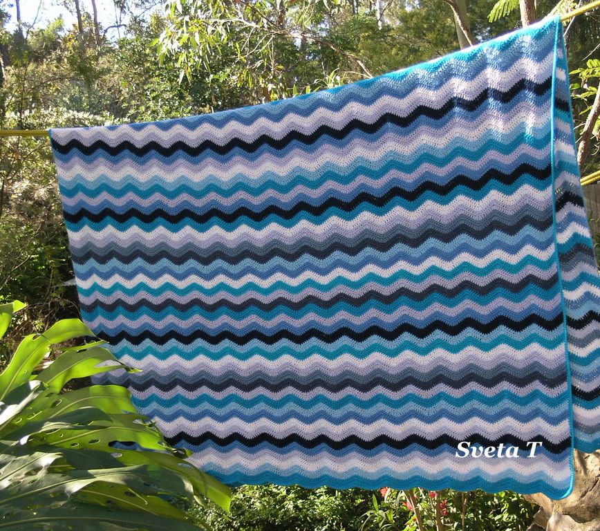 На тех фото, где плед перекинут через веревку, видно только его половину. Размер - около 160 см х 215 см. Я использовала от одного до трех мотков акрила 8-10 ply, белого, голубого и синего разных оттенков. А общее колчество пряжи подсчитать забыла. :)