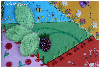 У лета, впрочем, как и у других пор года, есть свои особенности. Теплая речка, море, свежайшая зелень, поспевают ароматные фрукты и ягоды, расцветают поляны цветов, солнышко согревает своими лучиками… Вот такое полноценное лето вышивала я в совместнике с Зиной. Это была чудесная квилтовая авантюра. Каждый кусочек квилта рассказывает о каком-то периоде лета. Можно долго рассматривать работу и мечтать о чем-то приятном.