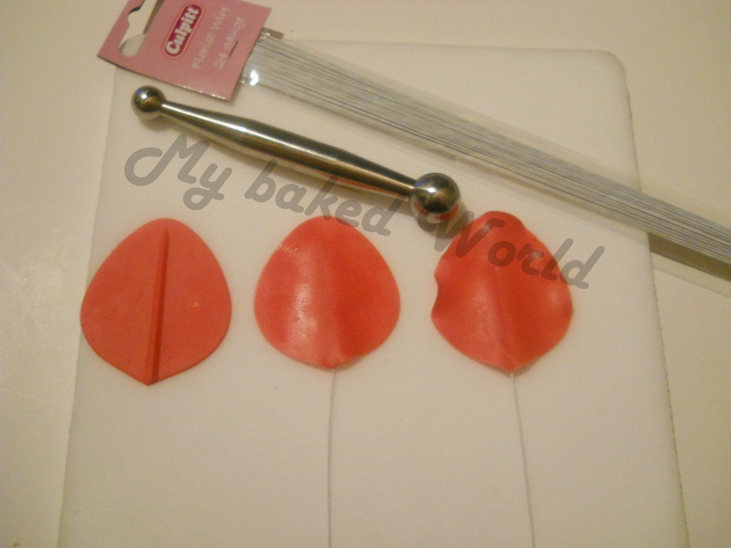 Раскатать на специально доске с углублениями, вырезаем формочкой и вставляем проволоку №26 смазанную клеем в паз. Обрабатываем края лепестков булькой. Делаем таких лепестков 6 шт.