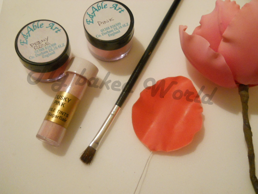 Далее подкрашиваем лепесток сухими порошковыми красителями (например пастелью) Используем розовый и зеленый цвет.