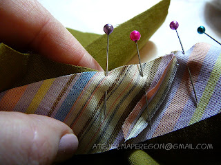 На прямых участках косую бейку натягиваем, а в местах скруглений накалываем с посадкой.