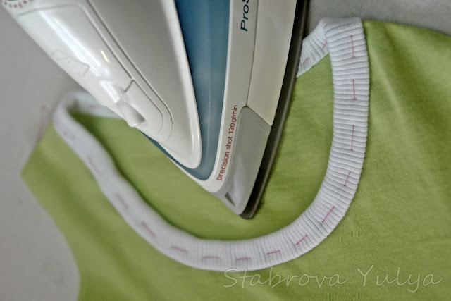 8 .Отстрачиваем горловину распошивальным швом. Заправляем нитки стыка строчки.   Приутюживаем.