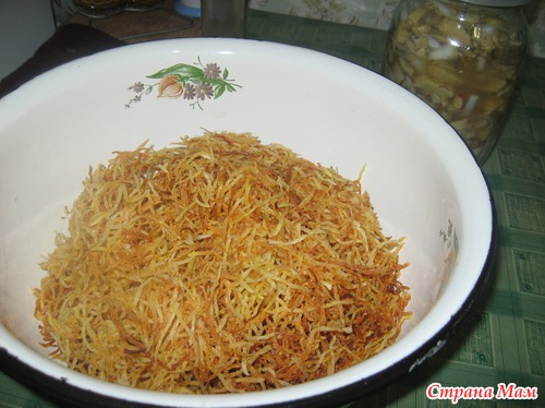 Автор: Anetta-anМой самый любимый салат! Пробуйте! Наконец я его приготовила подруге на день рождение. В первую очередь надо нажарить картофель пай. Жарю всегда заранее, за один или два дня, чтобы потом не замарачиваться. Как я это делаю просто опишу, не фоткала, забыла. Чищу картофель штук 10 среднего размера, держу в воде, туда же в воду натираю картофель на корейской терке, если нет, то можно на обычной крупной терке. Немного картофель натертый пусть постоит в воде, это для того чтобы вышел крахмал. Затем раскладываю на столе полотенце, выжимаю две жменьки картофеля, раскладываю на полотенце на одну сторону, а другой стороной как бы вытираю картофель. Это для того что картофель был хрустящим. Итак жарю по этапно весь картофель. Вот нажарила чашку, жарим в раскаленном масле, выкладывая в чашку не забываем солить.