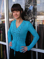 Жакет с листочками связан спицами (или на вязальной машине). Листочки связаны спицами №3,5 и пришиты.