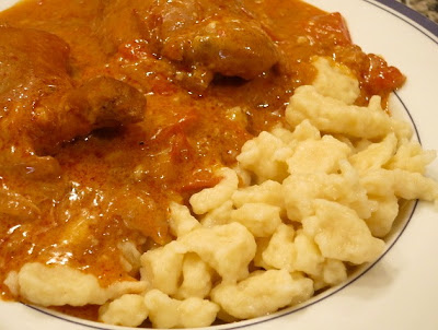 На растопленном горячем смальце остро обжарить мясо, добавить лук и ещё три минуты с мясом жарить. Залить половиной бутылки вина, добавить чеснок, изюм, оливки, тимьян и посолить.