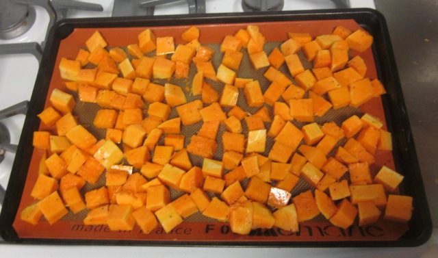 Выкладываем кубики тыквы в один слой на противень, застеленный фольгой или силиконовым ковриком для выпечки. Ставим в разогретую до 205 С (400 F) духовку на 30 минут.
