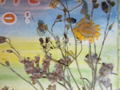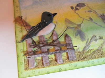 Последнее время меня тянет эксперементировать со структурами. В данном случае это картон, беспорядочно вымазанный гессо. Сверху покрыт акрилом и пастой inka-gold. Сама картинка по периметру была обведена глосси. Но у меня не было терпения ждать пока он высохнет, поэтому я решила "просушить" его феном для эмброссинга. Что тут началось! Началось извержение глосси!!! Все бурлило и надувалось огромными пузырями, которые потом лопались, и распластывались по бумаге причливыми формами. Результат меня, в принципе, устроил. Единственное, распечатанная на струйном принтере картинка, начала менять цвет в тех местах, где был нанесен глосси. Края стали преобретать устойчиво розовый цвет, присутствие которого меня совсем не удовлетворяло, а даже расстраивало. Пришлось опять прибегнуть к акрилу и к пасте inka. Они сделали свое дело качественно!