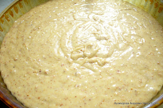 Одну-две столовых ложки орехов отложите для посыпки верха пирога. Перемешайте тесто - оно должно быть густым, тяжело падать с ложки. Выложите тесто в большую форму для выпечки или на противень с бортиками.