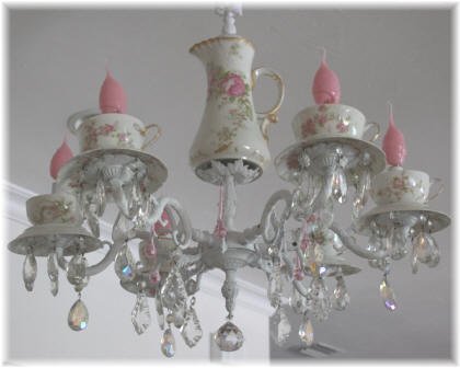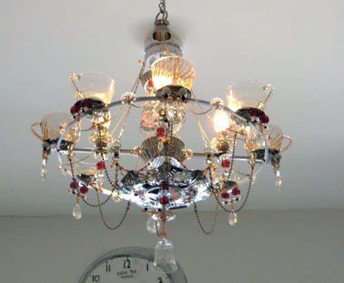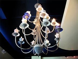 Можно не ставить и не класть в чашки ничего, а просто расположить на канделябре гирлянду, некоторые лампочки которой будут находиться внутри чашек. Тогда чашки (особенно из тонкого фарфора) будут загадочно светиться в темноте!