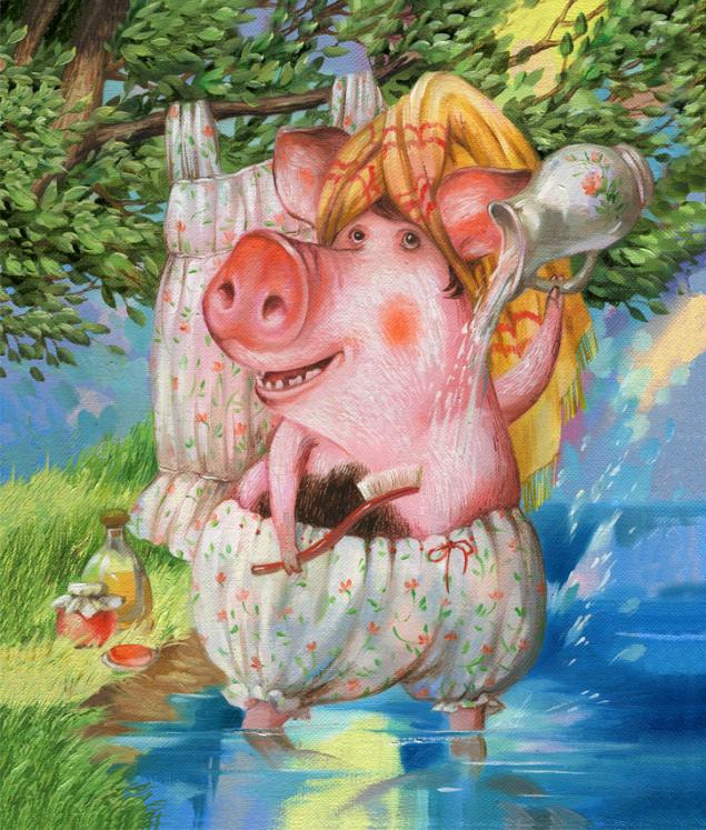 Картина "Чистая Хрюша", холст/масло, 30х25 см, 2013 г. Хрюша с радостью поселится в детской комнате и станет веселым напоминанием вашим детишкам, как важно быть чистым