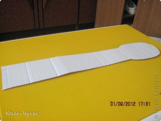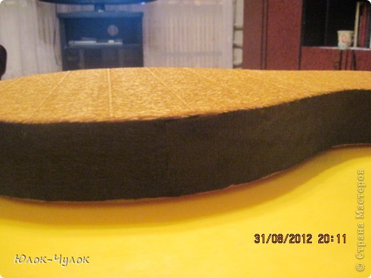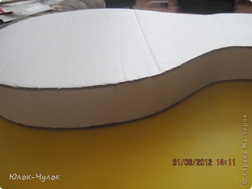 теперь нужно сделать бока. на "осинке" я видела, что их делали из утеплителя, но я такой не нашла и решила что сделаю из картона. для этого померила сначала конфету( которая на бока будет крепиться) и отмерила на картоне ее ширину+ по1см. на подгиб, т.к. нужной длины картона у меня не было, я его склеила. на фото видно. внутри боку гитары укрепила приклеив на них еще картон, шириной с конфету.