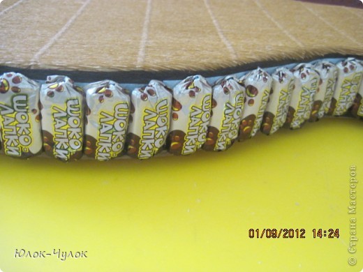 приклеиваем на двухсторонний скотч конфеты, предварительно загнув хвостики с двух сторон. для надежности я еще прошлась клеем прямо сверху скотча, так чтобы уж наверняка не отпали.