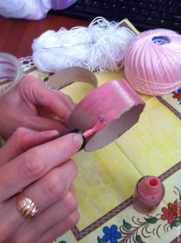 Если покрывать лаком - желательно выбирать цвет лака под цвет ниток, что б через вязку не просвечивался тёмный цилиндр. (Заранее готовим ватку и ацетон вытирать пальчики). Хотя я думаю можно использовать любые остатки лака для ногтей, которого не жалко,
