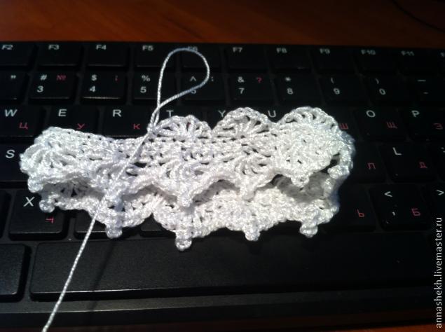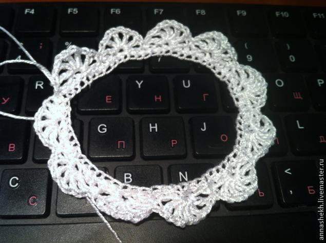 Теперь приступаем к украшению браслета ажурным узором. Вяжем снова воздушную цепочку такого же размера (60 петель), соединяем, идем по кругу первый ряд столбиками с накидом. Далее вывязываем любой ажурный узор который подходит по размерам к браслету. (Например 1ряд: столбики без накида; 2ряд: 5 столбиков с накидом через 1 воздушную петлю в столбик безнакида нижнего ряда - переступая 2 столбика без накида нижнего ряда; 3ряд: обвязать столбиком без накида - посередине "лепесточка" - пико.)