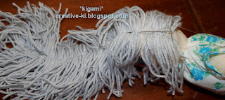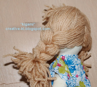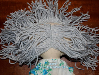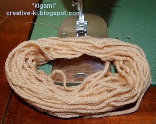 Для волос наматываем пряжу на дощечку (или любой другой предмет) необходимого размера, снимаем и делаем строчку с мелким шагом на машинке.