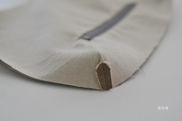 10. Trim seam allowance to 1/2”. Repeat for remaining corners (two exterior and two lining pieces). Once you’re nish with the corners, turn the bag RSO through the lining opening you left. Sew the opneing closed by machine and push lining into the assembled exterior. Set aside.