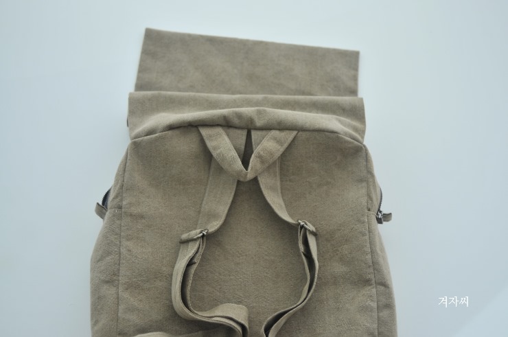 16. Loop the small canvas straps through the metal rectangle at the end of the long strap. Place it at the exterior bag, one end at the front and the other end at the bag, at 2” from the right side edge and 2.5” from the zipper edge. Make sure that the strap isn’t twisted. Pin it inplace and topstitch several lines to keep it strongly in place.