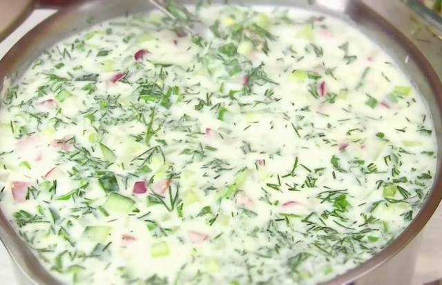 7.В завершении выливаю к ингредиентам кефир. Регулируйте густоту супа при помощи воды по своему вкусу.