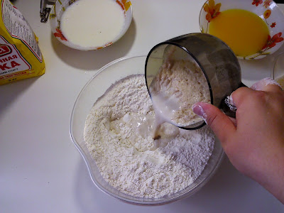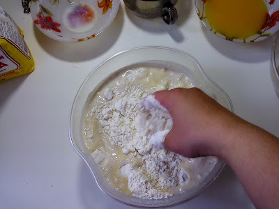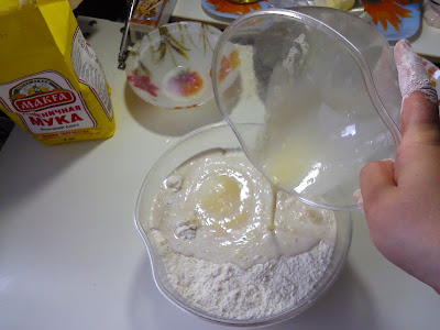 Всыпаем муку в тару для замеса, делаем углубление и последовательно выливаем туда все подготовленные ингредиенты (жиры в последнюю очередь)