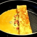 Как только омлет слегка подрумянится с одной стороны, слегка прижимая, начинаем его сворачивать в трубочку до середины.