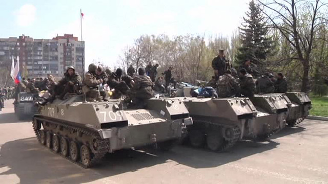 Экипажи нескольких десятков БМД, вошедших в Краматорск, заявили, что не будут открывать огонь по мирным гражданам. Машины остаются в Краматорске на занятых ранее позициях, на нескольких из них вывешены российские флаги, некоторые подняли флаги ВДВ, а пять-шесть машин — флаги Донецкой народной республики.