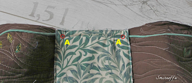Первым делом, соединяем короткие срезы полосы с молнией с боковыми срезами дна сумки. Шов прокладываем не насквозь, а до точек А, как на фото.