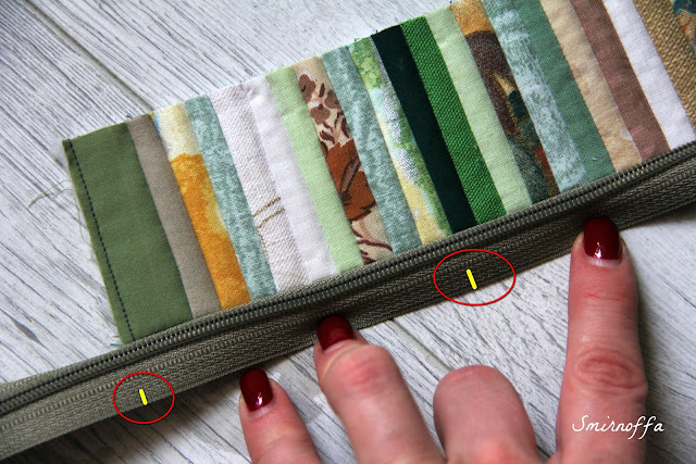 Теперь застегиваем молнию, и на второй тесьме молнии ставим метки, которые показывают начало и конец планки и какие-нибудь наиболее яркие элементы (если необходимо) для их совмещения.