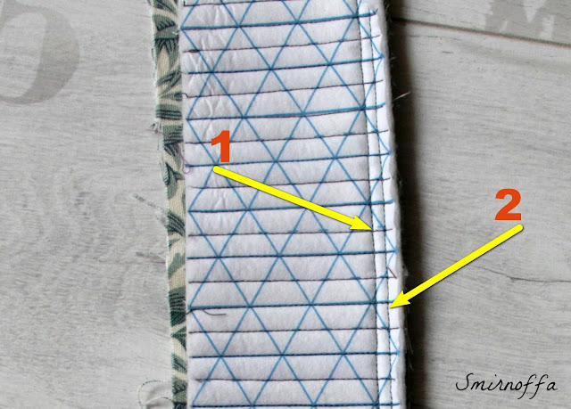 Для этого, сначала кант настрачиваем на боковые срезы детали 1, как показано на фото ниже. Используем лапку для притачивания молний и стараемся попадать в тот же шов, которым формировали кант на бейке.
