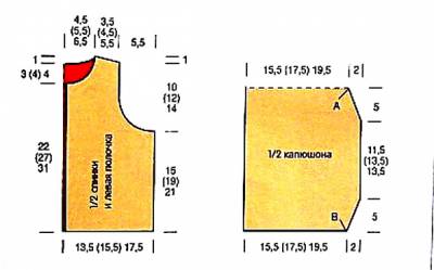 СБОРКА; выполнить плечевые швы Выполнить задний шов капюшона от А до В. Пришить капюшон к вырезу. На круговые спицы набрать по проймам по 54 (62) 70 а белой юоъю и вязать резинкой 1 р. белой, 2 р. черной и 2 р. белой »мтъю. Петли закрыть, выполнить боковые швы вшить молнию.