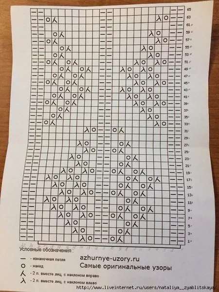 4-й ряд: 1 лицевая, * 1 лицевая, накид, 3 изнаночные, 2 вместе изнаночной, 2 вместе изнаночной скрещенной, 3 изнаночных, накид, 2 лицевые, 12 изнаночные, 1 лицевая*