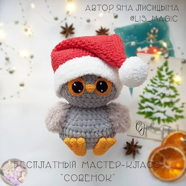 Бесплатный мастер-класс от Яны Лисицыной. Связанный крючком милый совёнок в новогоднем колпачке. |
