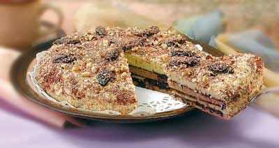 Готовые коржи выравнивают, обрезки протирают. Коржи смазывают кремом и укладывают друг на друга, пересыпая поочередно рублеными орехами и черносливом. Верхний корж и края смазывают кремом, края обсыпают крошкой, поверхность оформляют дольками орехов и целыми плодами чернослива.