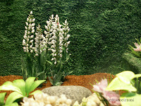 Белые цветы, веточки и пышные зеленые листовые формы, несколько камней и гирлянд; из них этот цветник.