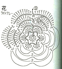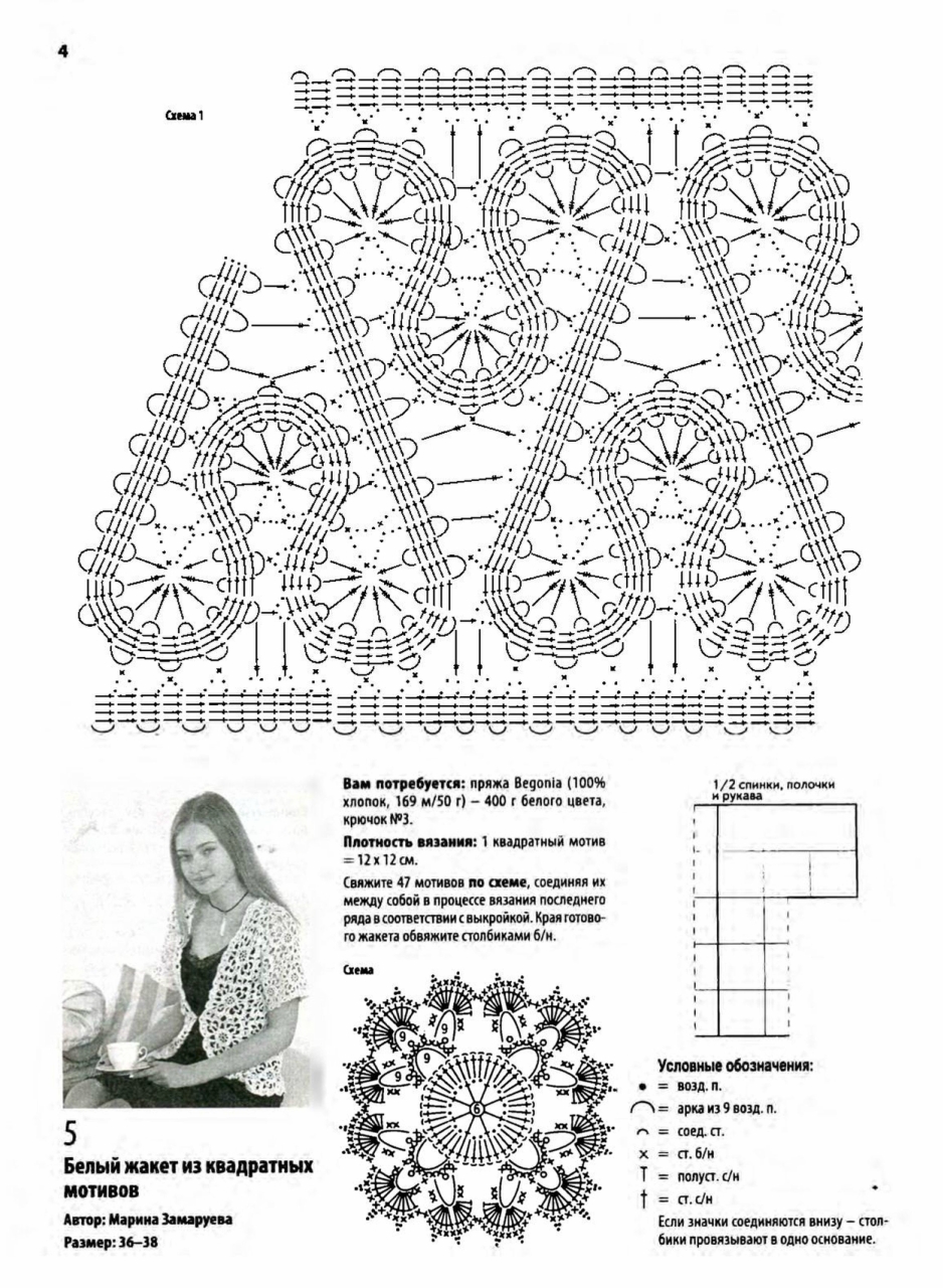 Квадраты: сложить 1 кольцо из нити и выполнить 1 круговой ряд согласно схеме 1. Каждый круговой ряд начать с указанного на схеме числа возд. п. вместо 1-й п. и закончить 1 соед. ст. или 1 ст. с/н в последнюю начальную возд. п. При необходимости перейти к началу следующего кругового ряда с помощью соед. ст. Все следующие квадраты выполнить, как 1-й квадрат, но при этом в последнем круговом ряду соединить в обозначенных на схеме стрелкой местах с выполненными ранее квадратами с помощью соед. ст. Выполнить 1–4-й круговые ряды 1 раз.