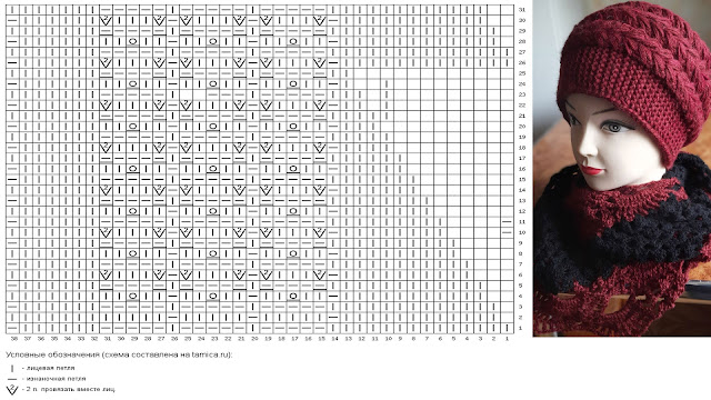 вязать согласно схеме, на которой приведены только лиц. р., в изн. р. петли вязать как указано.