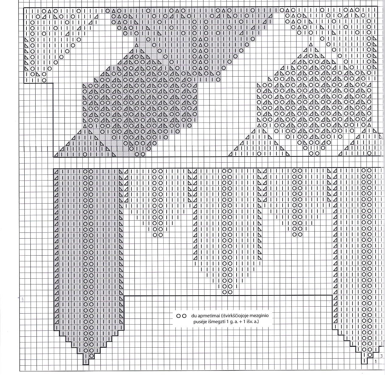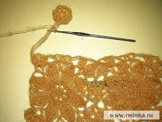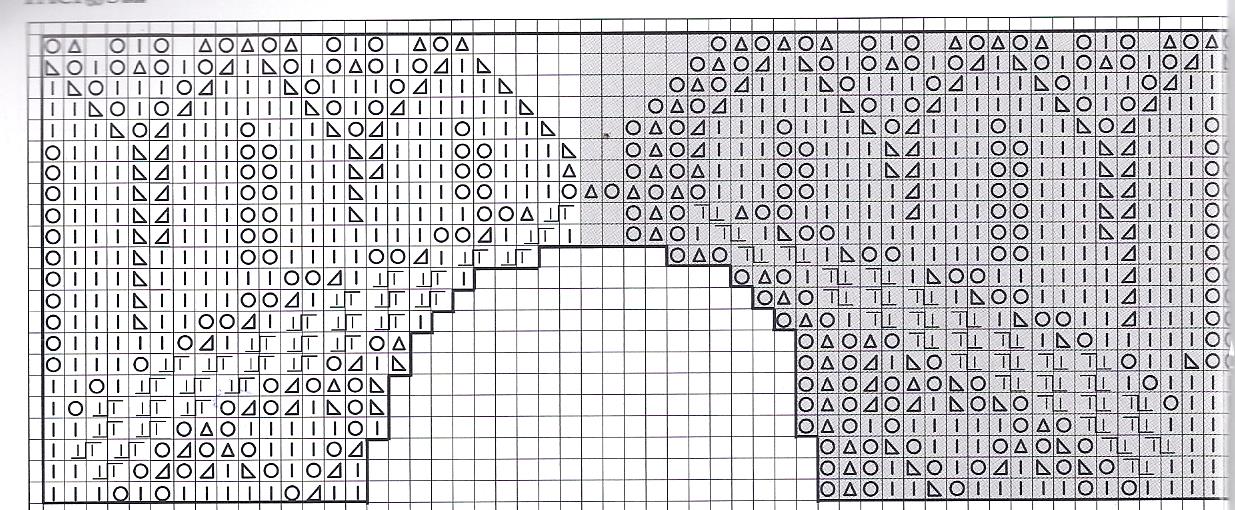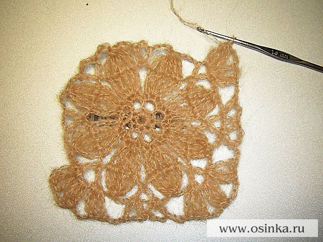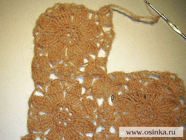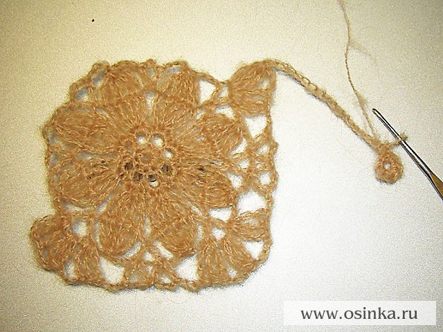 9. После всех убавлений по схеме получится вот такой уголок. Нить проводим внутрь гердана, вернувшись на несколько рядов. Цепляем иглой нитки междурядья и на них завязываем простые узелки. Снова проводим нитку через любой ряд, и еще один узелок. Прячем его, выводим иглу, и обрезаем нитку. Нижний ряд закончен.