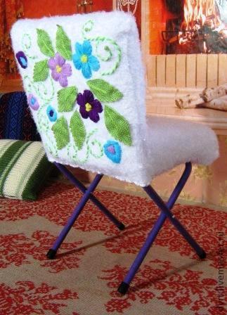 Ну и как же без декора! Листочки связаны и пришиты, цветы, стебли и бутончики вышиты шерстяными и акриловыми нитками для вязания. Вся эта флора расположена на обратной стороне спинки не случайно - во-первых, чтобы во время сидения выпуклые элементы вышивки не мешали опираться на спинку стула, а во-вторых, мне показалось, так будет оригинально и нестандартно.