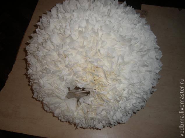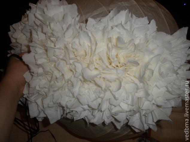 Сначала я хотела декорировать верх сооружения, сплетя группы нитей сеточкой макраме, потом подумала, что это разредит мне и низ сооружения и он станет более редким, прозрачным... Это мне не надо! Потом хотела украсить низ сооружения, прикрепив для тяжести на каждую нитку по бусине или хрусталику. Потом подумала, что так я увеличиваю шансы ниток на запутывание, а это мне тоже не надо! Так что я просто подравняла все нити до нужной длины и опалила кончик каждой нитки зажигалкой. да-да, все 420 штук!