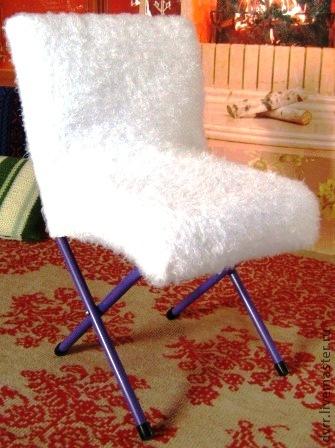 И вот, на стационарную флисовую обивку сооружаем парадный съемный чехол, связанный из белой синтетической пряжи под поэтическим названием Лебяжий Пух. Он шелковист на ощупь и мехоподобен на вид