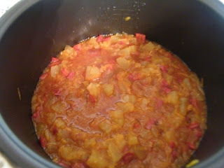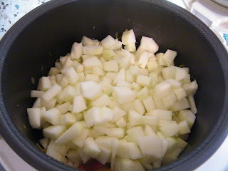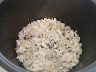 Лук порезала кубиками, в кастюльку налила растительного масла (4-5ст.л) и поставила режим "выпечка", клапан сняла.