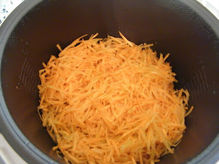 Пока лук начинал шкворчать, потерла морковь и отправила к лучку, перемешала и занялась перцем.