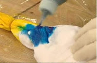 3. Объемными красками можно рисовать по шаблонам. Положим шаблон на футболку и внутрь рисунка выдавим немного краски. Мягкой кистью растираем краску по рисунку, заходя на край шаблона. Так заполним всю площадь рисунка . После частичного высыхания можно кончиком ручки добавить мелкие детали.