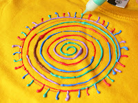4. Солнышко из спирали сначала легко означим ручкой на текстиль, потом начнем рисовать спираль, меняя краски. Короткие лучики тоже сделаем разноцветными.