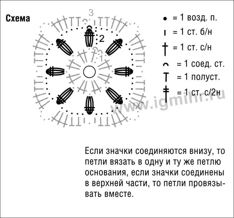 Квадрат: вязать круговыми рядами по схеме. Для 1-го квадрата выполнить белой нитью начальную петлю, связать 3 возд. п. вместо 1-го ст. с/н и выполнить круговой ряд, как обозначено, при этом ст. с/н вязать в начальную петлю и закончить 1 соед. ст. в 3-ю заменяющую возд. п. Стянуть начальную петлю до диаметра 1 см. Для 2-го кругового р. присоединить бирюзовую нить, 4 возд. п. вместо 1-го ст. с/2н и связать круговой ряд, как обозначено, закончить 1 соед. ст. в 4-ю заменяющую возд. п. Для 3-го кругового р. присоединить нить цвета майской зелени, 1 возд. п. вместо 1-го ст. б/н и связать круговой р., как обозначено, закончить 1 соед. ст. в заменяющую возд. п. Связать 1 раз с 1-го по 3-й круговой р. Вязать во 2-м круговом р. ст. с/2н и в 3-м круговом р. все петли в возд. п. предыдущего кругового ряда. Все следующие квадраты выполнять, как 1-й квадрат, но в 3-м круговом р. присоединяться к предыдущим квадратам. Для этого выполнить в углах 2 возд. п. + 1 доп. соед. ст. в соответствующую угловую арку предыдущих квадратов и 2 возд. п., на боковых краях вместо средней возд. п. выполнить 1 соед. ст. в соответствующую возд. п. предыдущих квадратов. Если 4 квадрата совмещаются углами, выполнить 1-е соединение, как описано, для 2-го и 3-го соединения вязать 1 соед. ст. в 1-й соединяющий соед. ст.