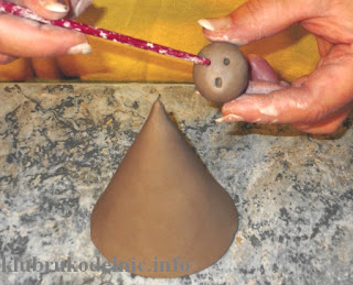 3. Из глины скатаем шарики, примерно такие, как пинг-понговый мячик. Это будут головки ангелочков. Деревянной палочкой (можно толстой спицей для вязания) сделаем глазки, нос, рот и приклеим суспензией к платью. Маленькие кружки-волосы намажем рукой, намоченной в суспензии, и тоже приклеим на головку ангела.